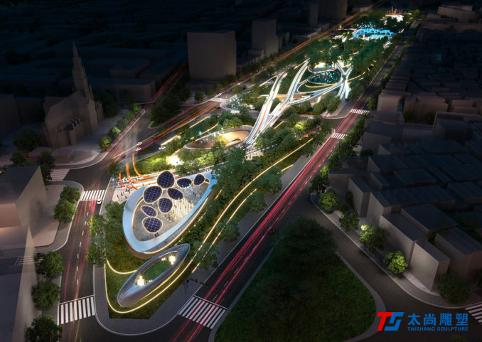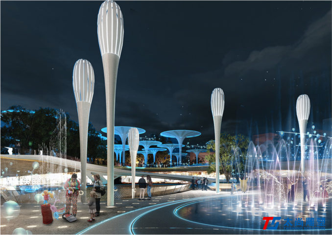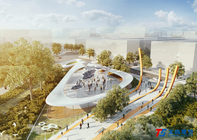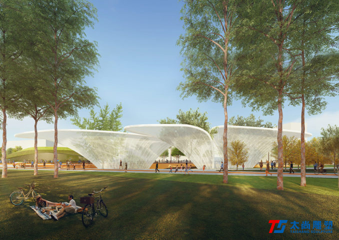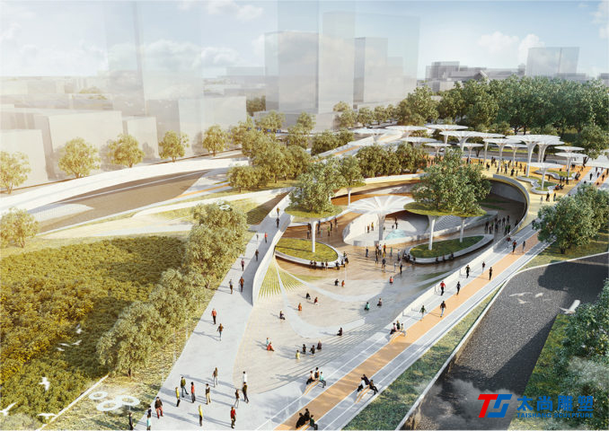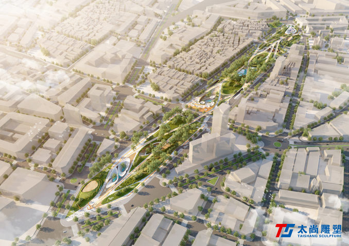太尚雕塑的設(shè)計(jì)解釋是一個(gè)關(guān)鍵的設(shè)計(jì)元素。主要的步行和活動(dòng)網(wǎng)絡(luò)通過沿著場(chǎng)地前鐵路曲線的人行道被輕輕抬高,提醒游客其過去的城市結(jié)構(gòu)。它們勾勒出主動(dòng)和被動(dòng)空間的混合,使我們能夠創(chuàng)建一個(gè)高度連接和可滲透的公園空間,同時(shí)最大限度地保留并最大限度地減少對(duì)場(chǎng)地現(xiàn)有成熟樹木的影響。人行道的末端是一個(gè)戲劇性的扭曲鋼雕塑,進(jìn)一步紀(jì)念了基礎(chǔ)設(shè)施的歷史。